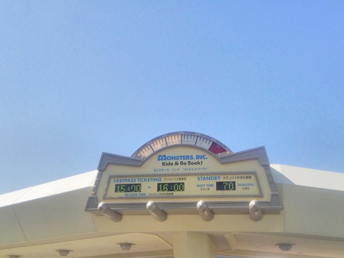 - モンスターズインクのFPは15時台で、取得に待ち列無し。混んでるんだか、空いてるんだか。 #TokyoDisneyLand pic.twitter.com/iaEIOZ5V8S posted at 08:59:24